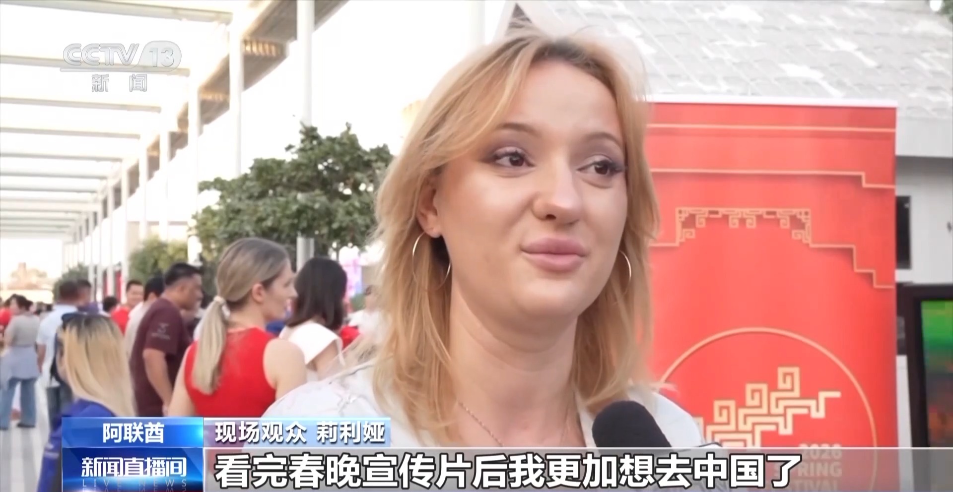 现场观众 莉利娅:看完春晚宣传片后我更加想去中国了,同时,我也祝所有中国人新春快乐,马年快乐。